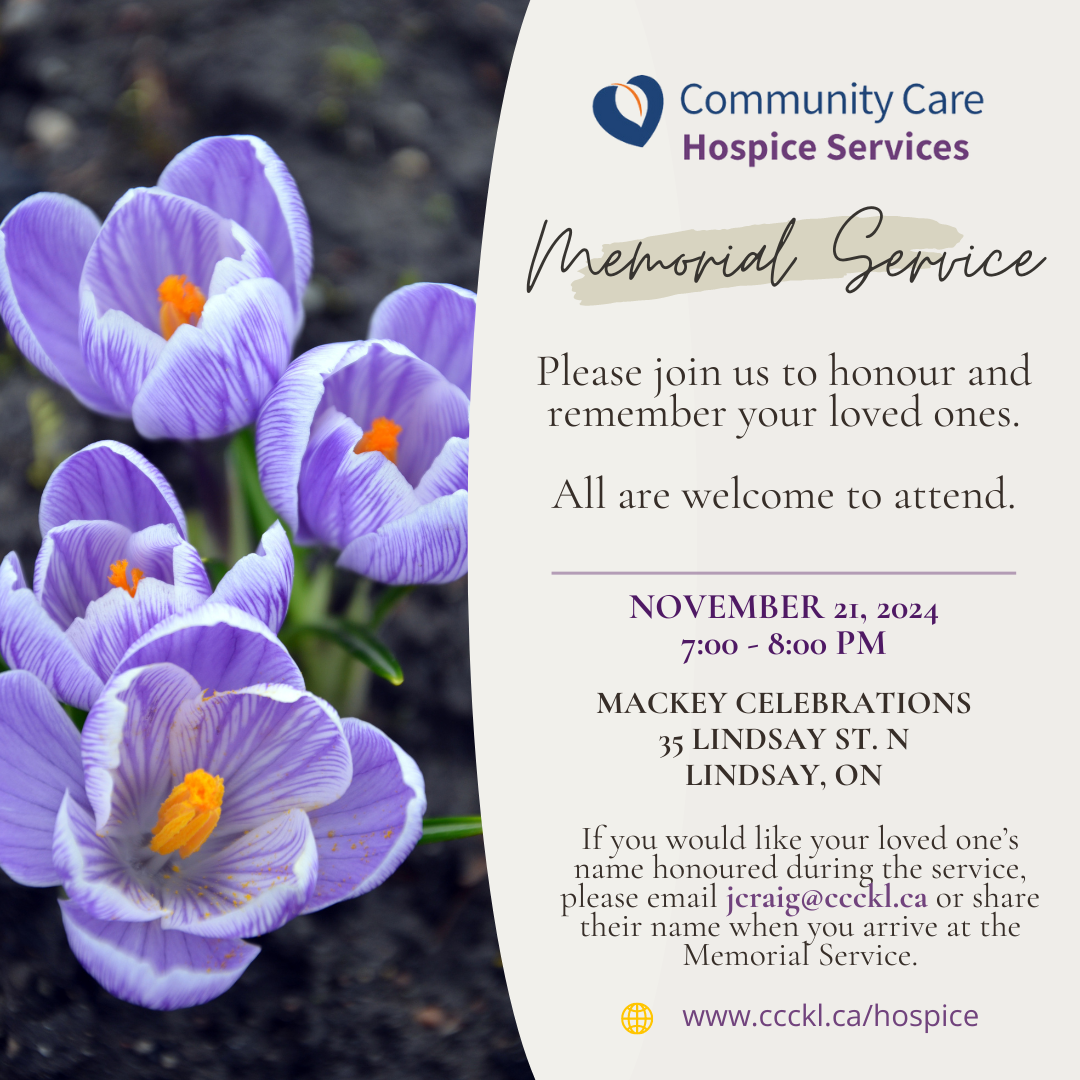 Mackey Celebrations 35 Lindsay St N, Lindsay, ON, CanadaPlease join us to honour and remember your loved ones. All are welcome to attend. If you would like your loved one’s name honoured during the service, please email jcraig@ccckl.ca or share their name when you arrive at the Memorial Service.