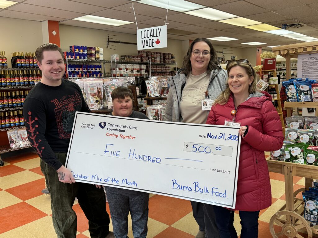 We are extremely grateful to Burns Bulk Food for hosting this fundraiser. Each month, Burns selects a local charity or non-profit to support through their “Mix of the Month” initiative. They plan and pack 100 bags of candy in-house and sell them for $15, with $5 from each bag donated to the featured organization. Community Care was honoured to be chosen for October 2025, with the theme “Sweet and Sour Scares for Community Care.” The bags sold out in a record 11 days! Thank you, Burns Bulk Food, for your incredible generosity and for everything you do for our wonderful community here in Kawartha Lakes.
