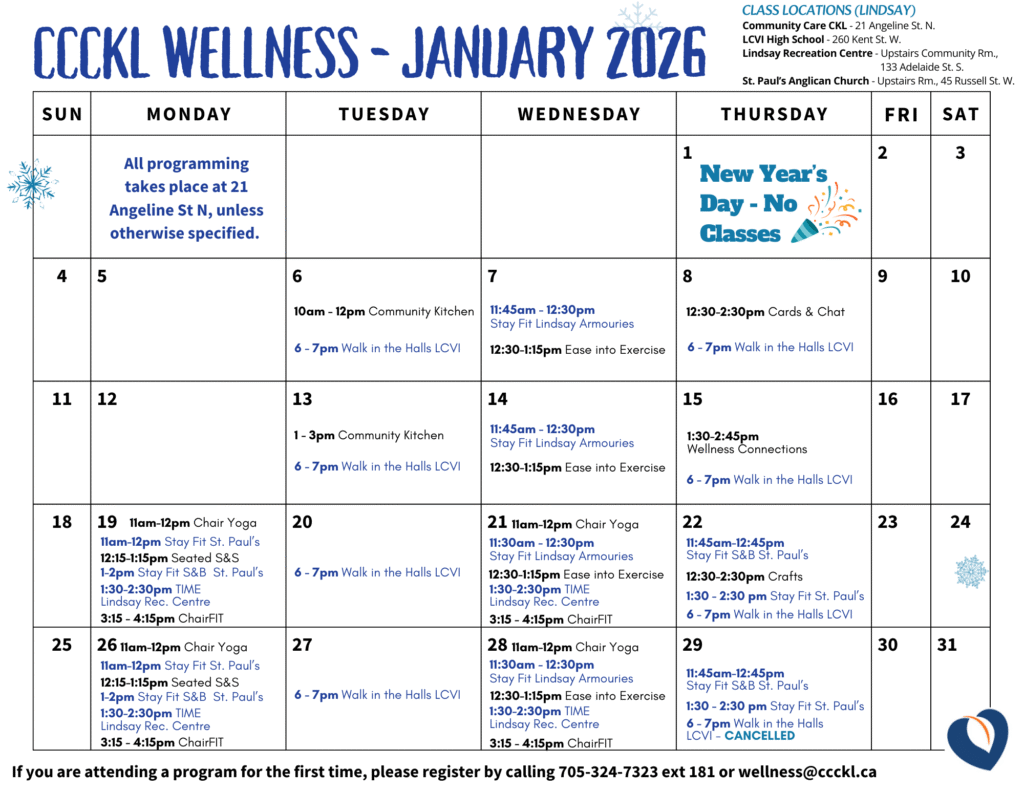 Each week we invite community to drop in to our space to socialize with others, learn new skills, meet new people and get connected with community supports. Located at 21 Angeline St. N in Lindsay, we offer social activities, guest speakers, exercise classes, cooking demonstrations and so much more!